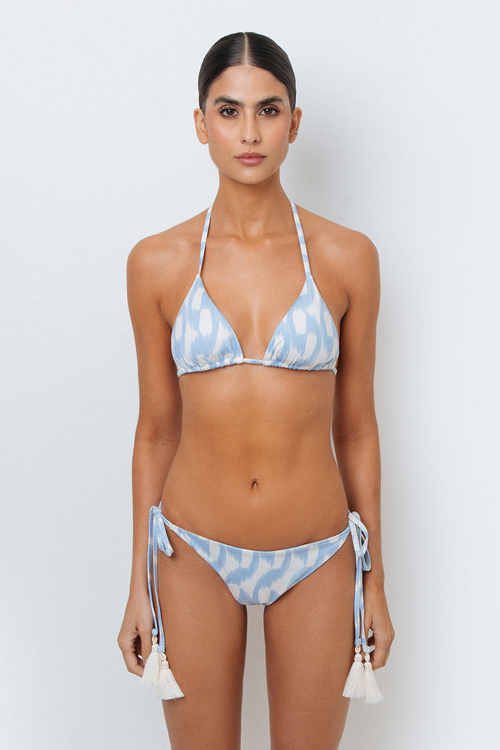 Detailed ties on back and neck.  Recycle fabric from PET Bottles , Uv 50 Protection, Printed with biodegradable inks.