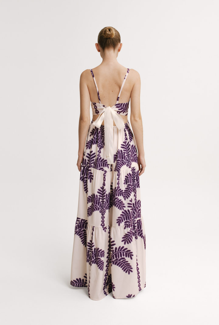Long dress with side cutouts that naturally flatter the figure. Features an open-back tie and skirt cut details for a feminine touch.