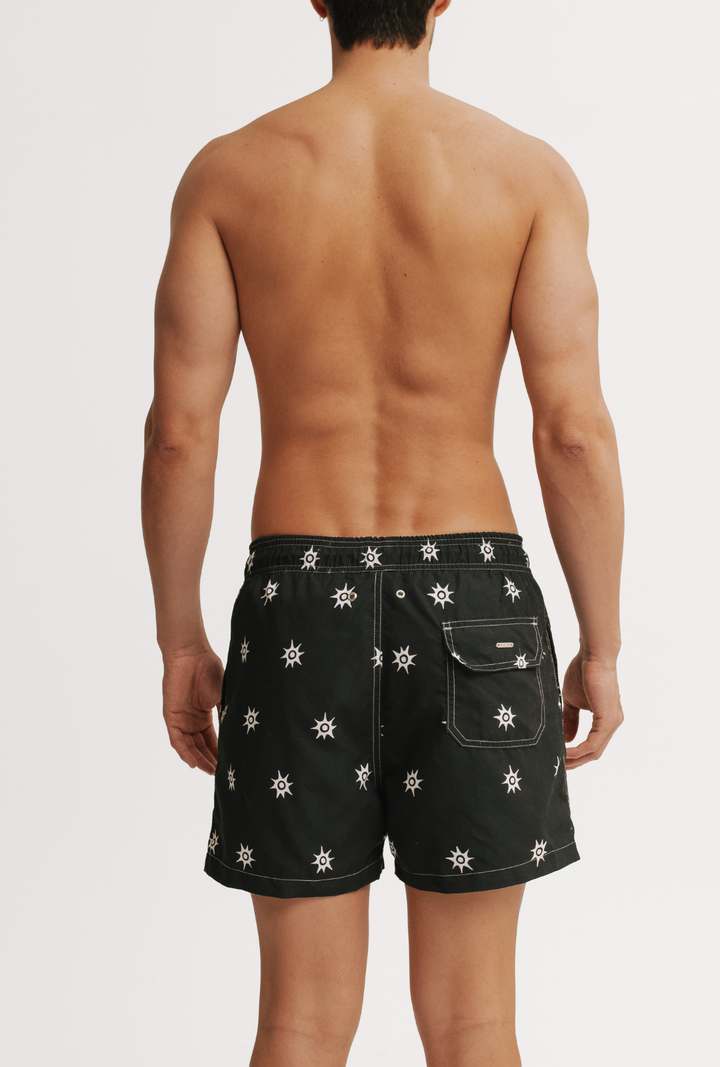 Men’s swim shorts with an elastic waistband and adjustable drawstring for a secure fit. Designed with a side zip pocket and a back pocket to keep your essentials close while you enjoy the beach or pool.